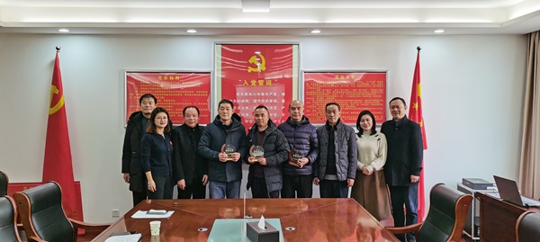 座談會后,集團領導為退休職工頒發榮休紀念章和紀念品,并與他們合影留念。