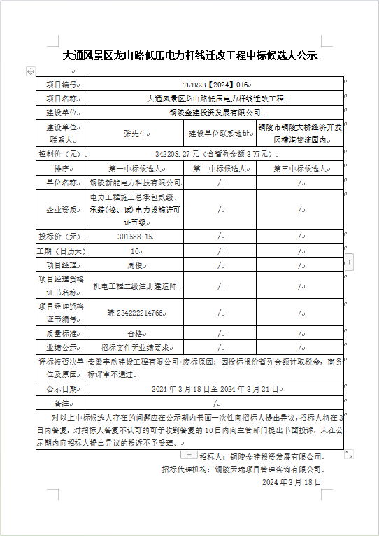 大通風景區龍山路低壓電力桿線遷改工程中標候選人公示