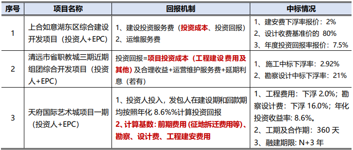 (2)投資成本收益為與墊資或延期支付等容易觸碰政策紅線的操作相區別,就“投資人+EPC”模式理論設計初衷而言,投資人應自擔施工總承包等投資成本,并主要通過項目本身產生的收入回收投資款、覆蓋債務本息,項目資產權屬自然也由其所有,典型案例如前述當陽市歇馬寨礦區建筑用砂巖礦(投資人+EPC)建設項目等。但目前實踐中,大量“投資人+EPC”項目基本沿用傳統EPC或“EPC+”項目的做法,將通過一定施工中標下浮、勘察設計中標下浮后的工程建設費用及其他費用列入投標報價,投資人中標實施后獲得該部分相應的投資成本收益,此外,還有不少項目將運營成本也納入其中。理論與實務的此處沖突甚至還引起了不少行業同仁對“真假‘投資人+EPC’”項目認定問題的思索,在此我們就不做過多探討。